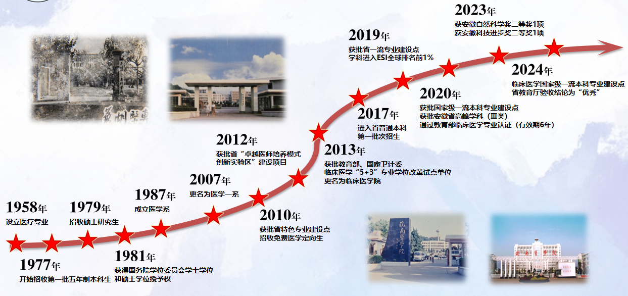 临床医学院是学校办学历史最为悠久、规模最大的二级学院,国内医学名家李济仁、刘贻德、孙瑞元、翟庆骏等曾在这里深耕三尺讲台。自1958年建校以来,临床医学专业在较长一段时期内为学校唯一开设的专业;1977年招收第一批临床医学专业五年制本科生,1979年招收临床医学专业硕士研究生;1987年根据学校发展需要成立医学系;2007年更名为医学一系;2013年更名为临床医学院,设有临床医学和康复治疗学两个专业。2019年临床医学进入ESI全球前1%学科,且排名逐年稳步提升;获批国家级一流本科专业建设点、安徽省高峰学科、安徽省一流专业、安徽省特色专业等。现有国家级住院医师规范化培训基地、国家级全科医生培养基地、安徽省住院医师规范化培训骨干师资培训基地、安徽省全科师资培训基地、省级示范实验实训中心。